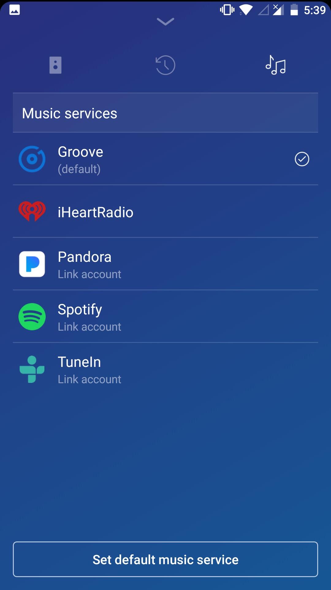 Der Lautsprecher kann über ein Windows- oder Android-Gerät eingerichtet werden und bei der Einrichtung gibt es auch die Option einen Streamingdienst für Musik auf dem Gerät einzurichten. Neben Groove von Microsoft bietet der Lautsprecher noch TuneIn, Pandora, iHeartRadio und Spotify als Option an.