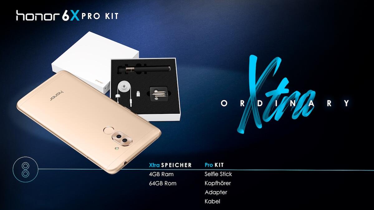 Diese ist mit 319 Euro etwas teurer, als das normale Honor 6X, das bekommt man aktuell für knapp 250 Euro auf Amazon, bietet aber auch mehr. Im Zusatzpack enthalten sind Gimmicks wie Kopfhörer, ein Selfie-Stick und ein USB-C-Adapter. Außerdem gibt es 64 statt 32 GB Speicher und 4 statt 3 GB Arbeitsspeicher.