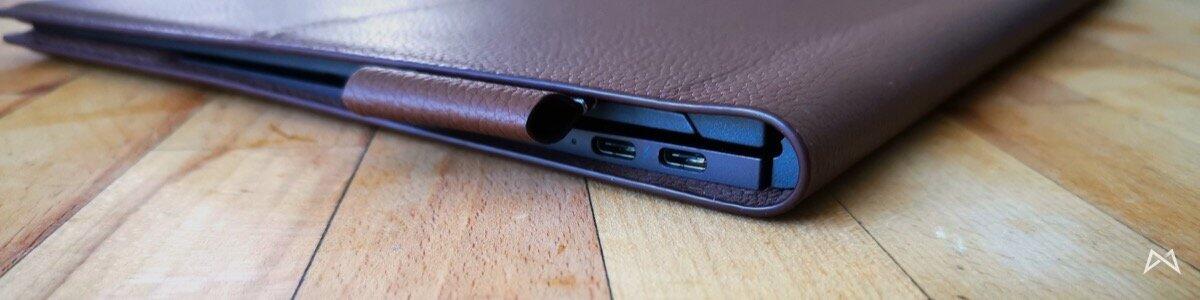 Erreichbare Anschlüsse bietet der Spectre Folio ak0020ng auf der linken Seite einmal einen Typ-C und einen Klinkensteckeranschluss und auf der rechten Seite zwei Typ-C Anschlüsse mit Thunderbolt.