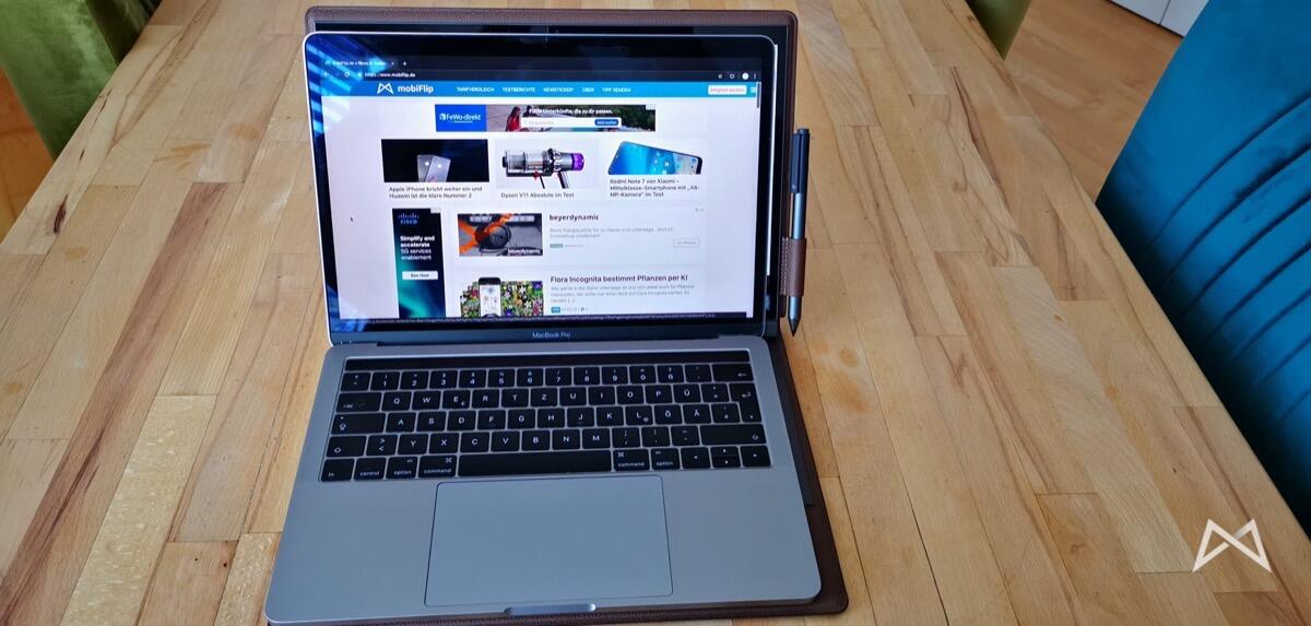 Aufbewahrt wird der Stylus in einer kleinen Lasche rechts neben dem Gerät. Mir persönlich gefällt der Stylus sehr und den dazugehörigen Touchscreen könnte ich mir auch an einem Macbook sehr gut vorstellen. Mal sehen, wie lange Apple noch für die Integrierung eines eben solchen benötigt.