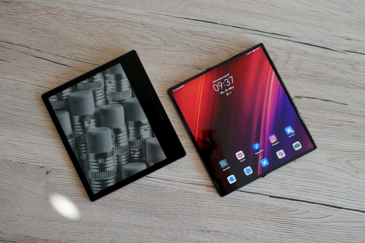 Ich muss gestehen: Das Design wirkt nicht gerade praktikabel für den Alltag, aber es ist durchaus beeindruckend, wenn man das Display aufklappt und dann ein kleines Tablet vor sich hat. Das Huawei Mate Xs ist in etwa so groß wie der Amazon Kindle Oasis und fühlt sich ehrlich gesagt wie eine schwere Version von diesem an.
