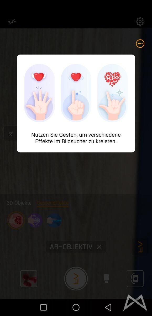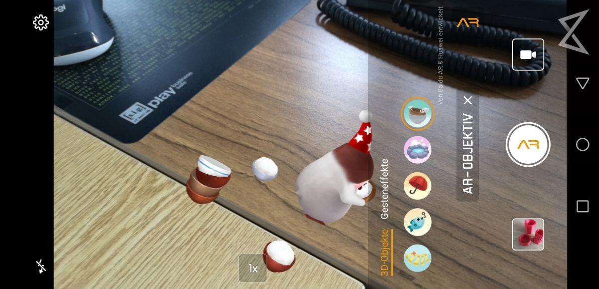 Die Kamera hat jetzt AR-Sticker. Zum einen können „witzige“ 3D Objekte via Geste in ein Foto reinprojiziert werden und zum anderen gibt es auch kleine Charaktere, welche ebenfalls via AR in eine Szene reingerechnet werden. Ähnlich, wie manche Filter aus Snapchat und Co.