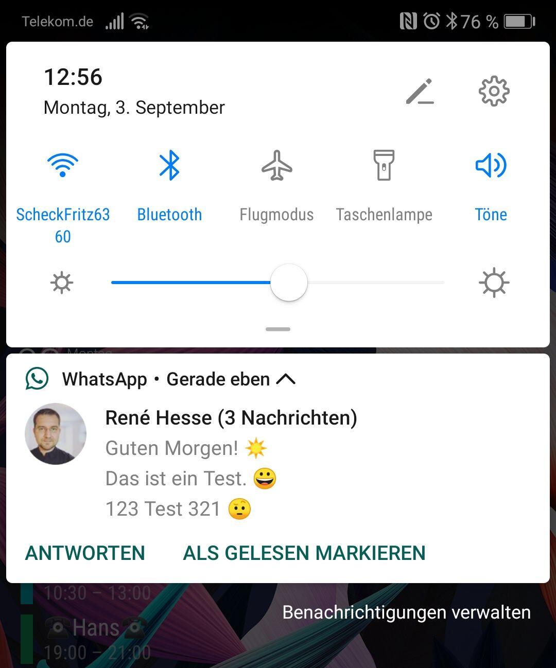 Auch die Notifications selbst wurden aufgebohrt. Es folgt als Beispiel eine Whatsapp-Nachricht (insgesamt 3 Nachrichten hintereinander), die ich nicht vorher auseinandergezogen habe. Die Notification wurde direkt so als Benachrichtigung angezeigt: