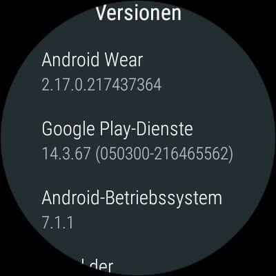 Das über Nacht eingetroffene Update lässt die Uhr weiterhin auf Android 7.1.1 mit Android Wear 2.17.0.217437364 (wer denkt sich solche Nummern aus?!) verweilen. Kein Wear OS in Sicht. Immerhin wurde aber das neue, fluffige UI aufgezogen. Wobei dies auch nur teilweise der Fall ist.