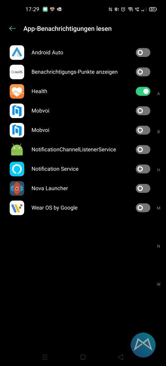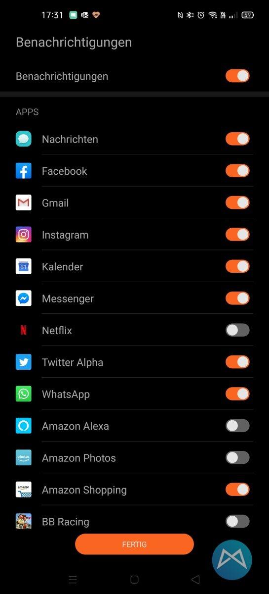 Einmal installiert, kann dort unter „Gerät“ die neue Smartwatch hinzugefügt werden. Dann müssen noch die Berechtigungen erteilt werden, damit die Benachrichtigungen auch auf der Uhr ankommen und dargestellt werden können.