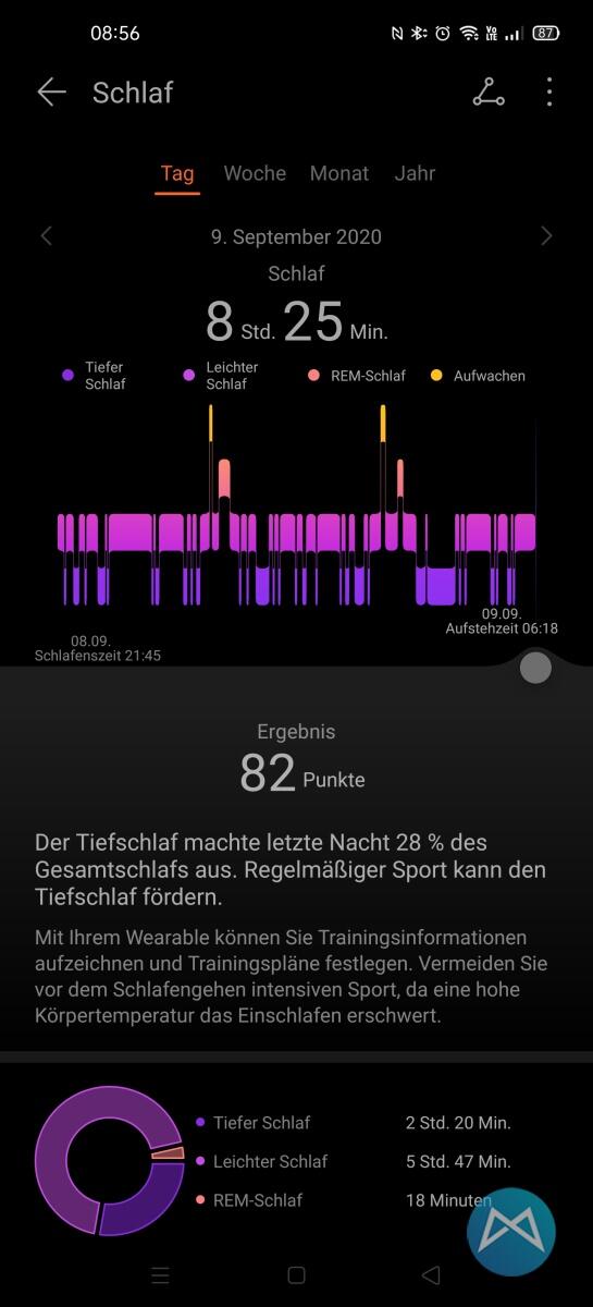 Nun ging es aber auch schon los. In der Huawei Health-App bekommt man angezeigt wie man schläft, wie viele Schritte man getätigt hat. Alles super schön grafisch aufgearbeitet und man sieht auch direkt, dass ich wegen Zahnschmerzen gerade eher Semi-guten Schlaf hatte.