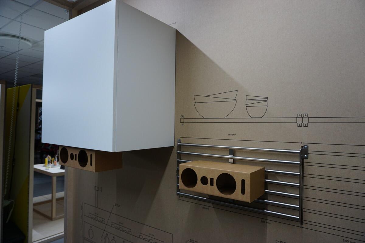 Die Idee von IKEA ist, dass „die Box sowohl in IKEA Regale passt als sich auch darüber und darunter montieren lässt, z.B. direkt unter das Küchenregal“. Auf den Bildern sieht man das Anhand des Pappe-Prototypen ganz gut. Das Design stammt komplett von IKEA, Sonos kümmert sich hier ausschließlich um den Sound der Speaker.