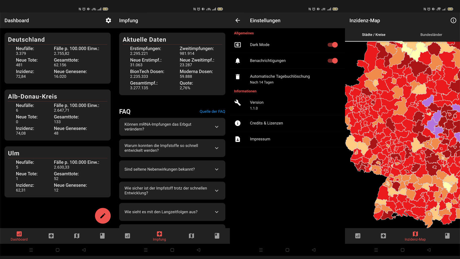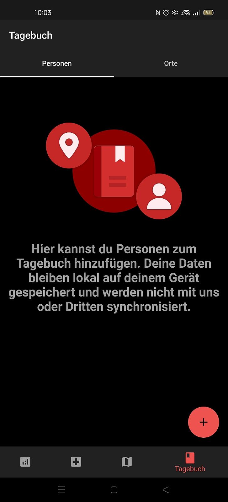 Selbstverständlich gibt es auch eine Landkarte mit den farblich dargestellten Inzidenzwerten und auch ein Kontakttagebuch wurde in die Anwendung eingepflegt. Die dort eingegebenen Daten bleiben selbstverständlich lokal auf dem Gerät gespeichert.