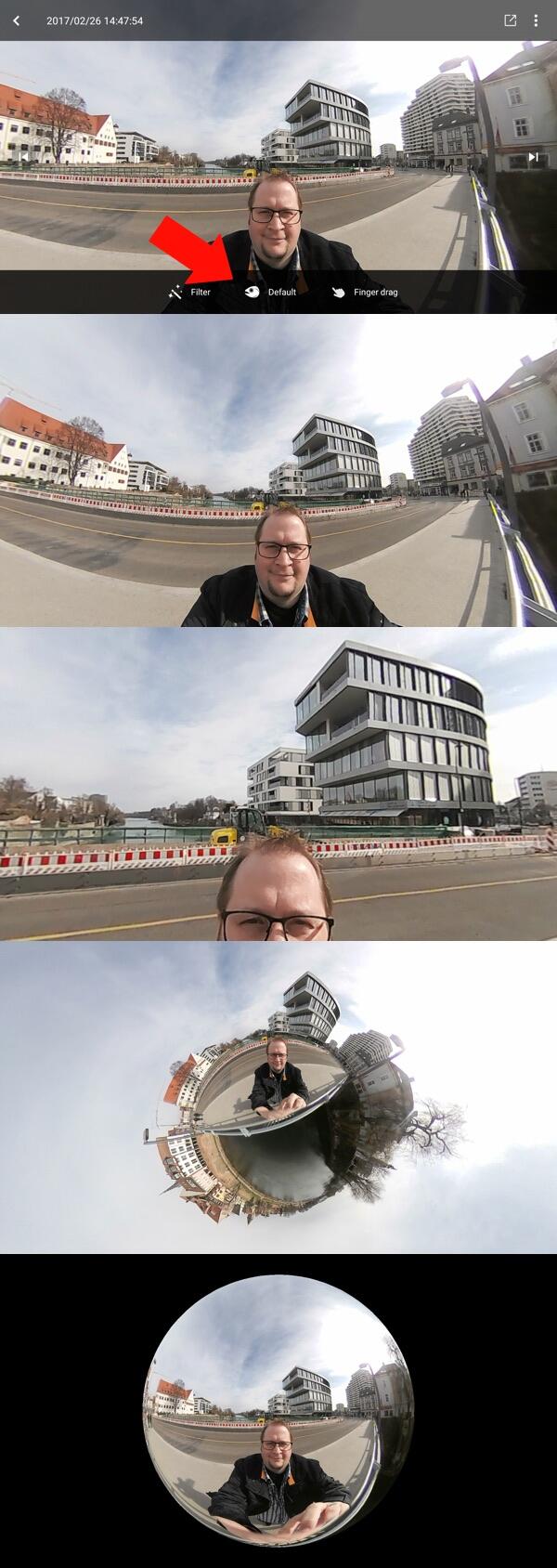 Die Wasserzeichen sind übrigens nicht fix und können auch nachträglich im Original-Foto geändert werden. Insta360 Air bietet zudem die Option das fertige Foto in verschiedensten Ansichten anzuzeigen und zu speichern. Auch das geschieht auf Knopfdruck (roter Pfeil) und kann jederzeit geändert werden.