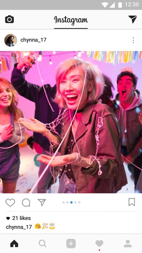 - Wenn ihr einen Beitrag mit mehreren Fotos und Videos in eurem Feed seht, werden euch die blauen Punkte unter dem Beitrag auffallen. Wischt hin und her um den ganzen Post zu sehen.