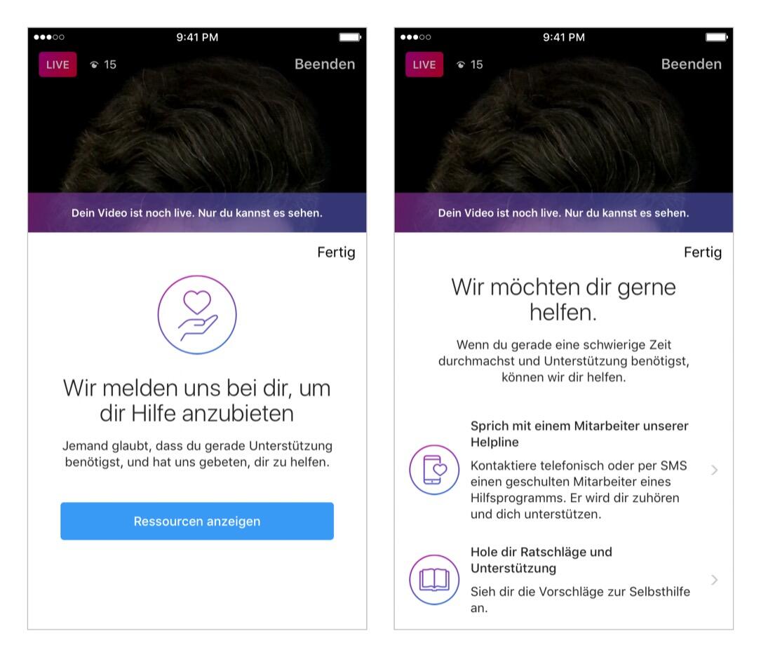 • Ab sofort könnt ihr Menschen anonym melden, die sich in einer Live-Übertragung labil zeigen und Unterstützung brauchen könnten.