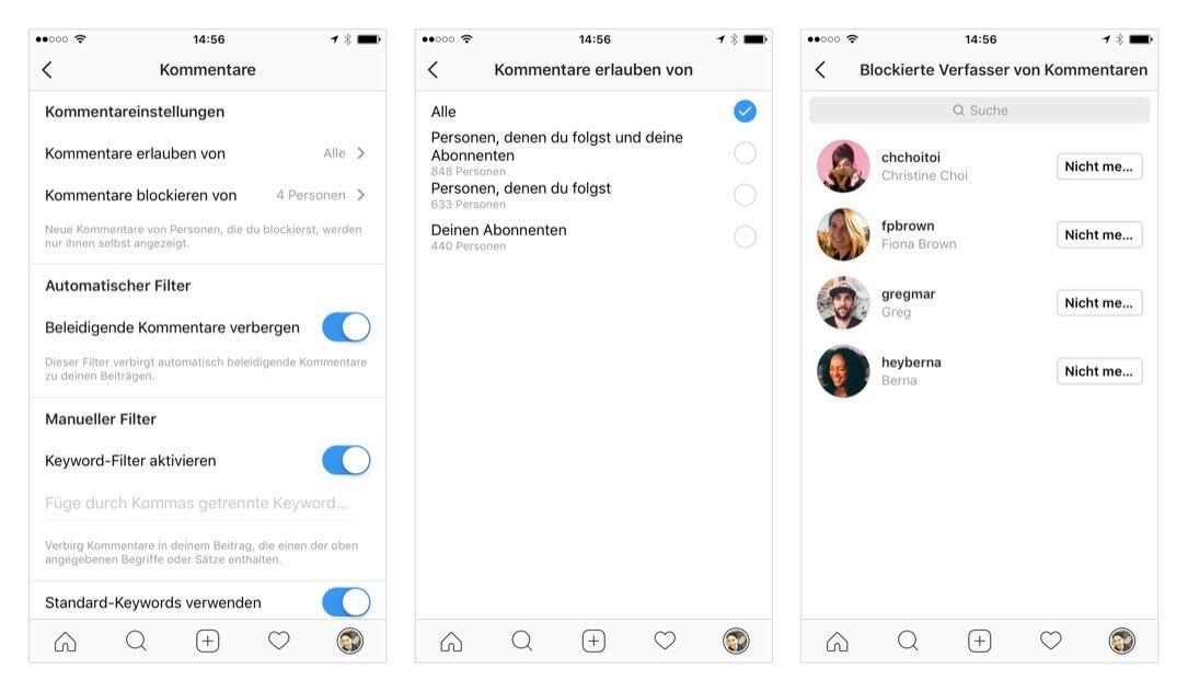 Auch lassen sich unangebrachte Kommentare nun blockieren. Bereits im Juni hat Instagram einen Filter angekündigt, der bestimmte beleidigende Kommentare automatisch blockiert. Das ganze funktionierte allerdings bisher nur auf Englisch, jetzt startet die Funktion in weiteren Sprachen – auch auf deutsch.