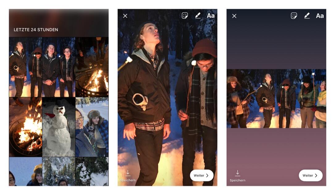 Fotos oder Videos aus dem Archiv können dann auch in den Originalmaßen hochgeladen werden. Freier Platz wird mit Farbverläufen gefüllt. Alternativ könnt ihr auch zoomen, so dass die Fotos und Videos den ganzen Bildschirm ausfüllen.