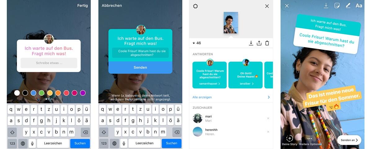 Dabei lassen sich die Fragen-Sticker sogar auch andersherum verwenden. Ruft man die eigene Community auf, im Volltext Fragen zu stellen, und eine Antwort enthält daraufhin eine solche, kann die Frage direkt in einer weiteren Story beantwortet werden. Die ursprüngliche Frage wird dann ohne Foto oder Benutzername angezeigt, sodass der Fragensteller anonym bleibt.
