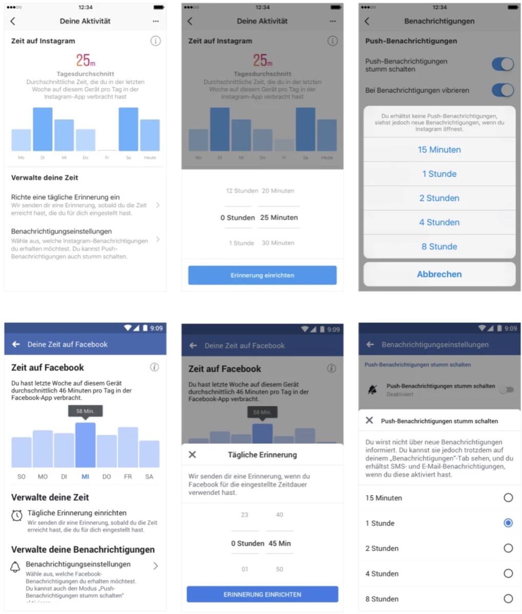 - Benachrichtigungseinstellungen: Mit der Funktion „Push-Benachrichtigungen stumm schalten“ könnt ihr die Benachrichtigungen der Apps vorübergehend einschränken. Um die neuen Funktionen zu nutzen, tippt einfach unter „Einstellungen“ auf „Deine Aktivität“ (Instagram) und „Deine Zeit auf Facebook“ (Facebook) und ihr gelangt direkt zum Dashboard.