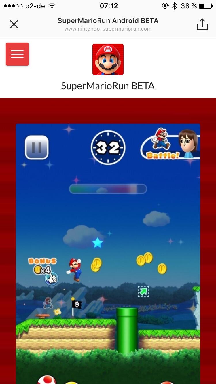 Heute ist mir eine Werbeanzeige für Super Mario Run begegnet. Habe ich erst mal ignoriert, doch dann ist mir aufgefallen, dass die Android-Version beworben wird. Für diese Plattform gibt es das Spiel aber noch gar nicht. Es kommt im März.