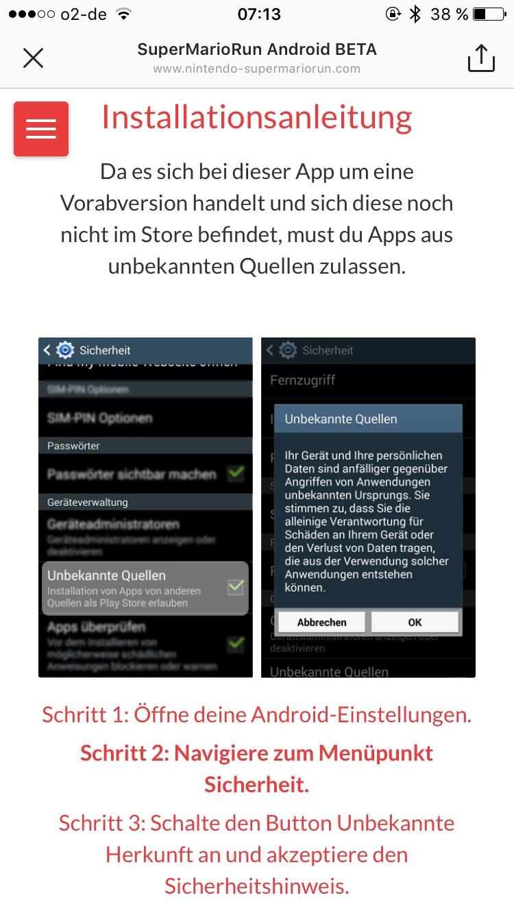 Auf dieser Seite gibt es diverse von Nintendo geklaute Screenshots und auch eine Anleitung, wie man Apps außerhalb des Google Play Store herunterladen kann. Die Nutzer werden hier aufgefordert das zu tun und sollen dann auch den Download-Button am Ende der Sonderseite (siehe Screenshots im Beitrag) klicken.