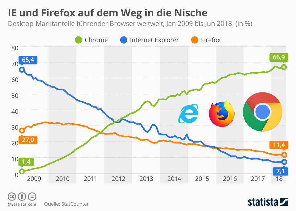 Immer weniger Menschen gehen mit Firefox und dem Internet Explorer online. Laut aktuellen Daten von StatCounter kommen beide Browser weltweit zusammen nur noch auf einen Desktop-Marktanteil von weniger als 20 Prozent. Verantwortlich für den Absturz ist Chrome. Der Google-Browser liegt derzeit bei rund 67 Prozent.