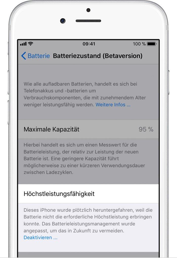 Besitzt man einen Akku, der nicht mehr genug Kapazität besitzt, dann wird das iPhone automatisch gedrosselt. Aktiviert man die volle Leistung und es kommt zu einem spontanen Absturz, dann wird die Drosselung wieder aktiviert. Man muss sie also immer neu deaktivieren, wenn man lieber die volle Leistung haben und mit Abstürzen leben möchte. Aber: Noch ist das alles eine Beta.