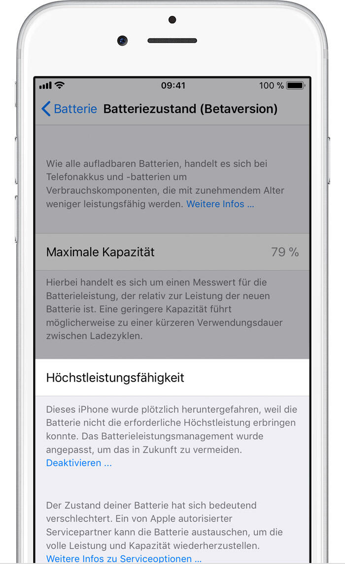 Besitzt man einen Akku, der nicht mehr genug Kapazität besitzt, dann wird das iPhone automatisch gedrosselt. Aktiviert man die volle Leistung und es kommt zu einem spontanen Absturz, dann wird die Drosselung wieder aktiviert. Man muss sie also immer neu deaktivieren, wenn man lieber die volle Leistung haben und mit Abstürzen leben möchte. Aber: Noch ist das alles eine Beta.