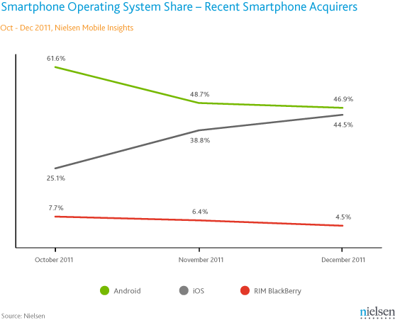 Das Marktforschungsunternehmen Nielsen hat ein paar interessante Zahlen vom US-Smartphonemarkt veröffentlicht, welche sich nur auf die Verkäufe neuer Smartphones im vierten Quartal 2011 beziehen. Besonders interessant ist dabei, dass Apple wohl vor allem mit dem iPhone 4S den Android-Verkäufen einen Dämpfer verpassen konnte. Je straffer es auf Weihnachten zuging, desto mehr Apfel-Smartphones wurden gekauft.