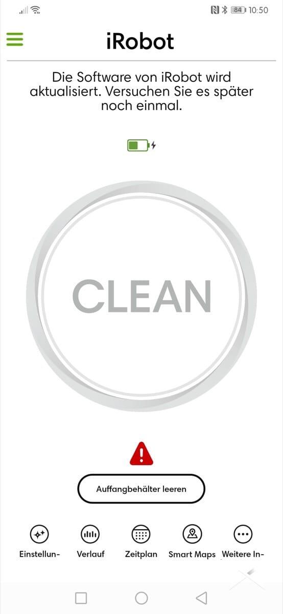 Dann muss der Staubsauger aufgeladen werden. Also einfach in die Absaugstation setzen und los gehts. Die runde Lampe um den großen CLEAN-Button auf der Oberseite zeigt dabei den Zustand der Batterie (blinkt oder leuchtet durchgehend etc.) an.