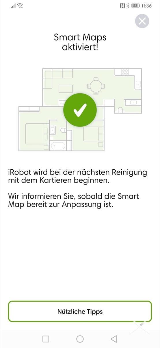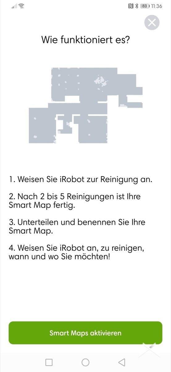 Ein Punkt, der extra noch erwähnt werden sollte, sind die Smart Maps bzw. das neu hinzugekommene Imprint. Diese benötigt man später für Dinge wie „reinige nur das Kinderzimmer“. Es werden also unter anderem vom Haus bzw. der Wohnung Karten erstellt. Hierfür muss während der Einrichtung in der App auch ein kleiner Hinweis akzeptiert werden: