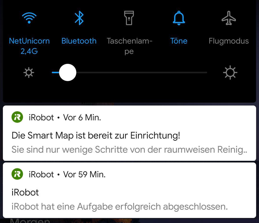 Ist das Konto erstellt, der Robosauger mit dem WLAN verbunden und die App installiert gibt es unter anderem im normalen Betrieb Nachrichten per PUSH aufs Handy, die darüber informieren, was der Sauger gerade so anstellt: