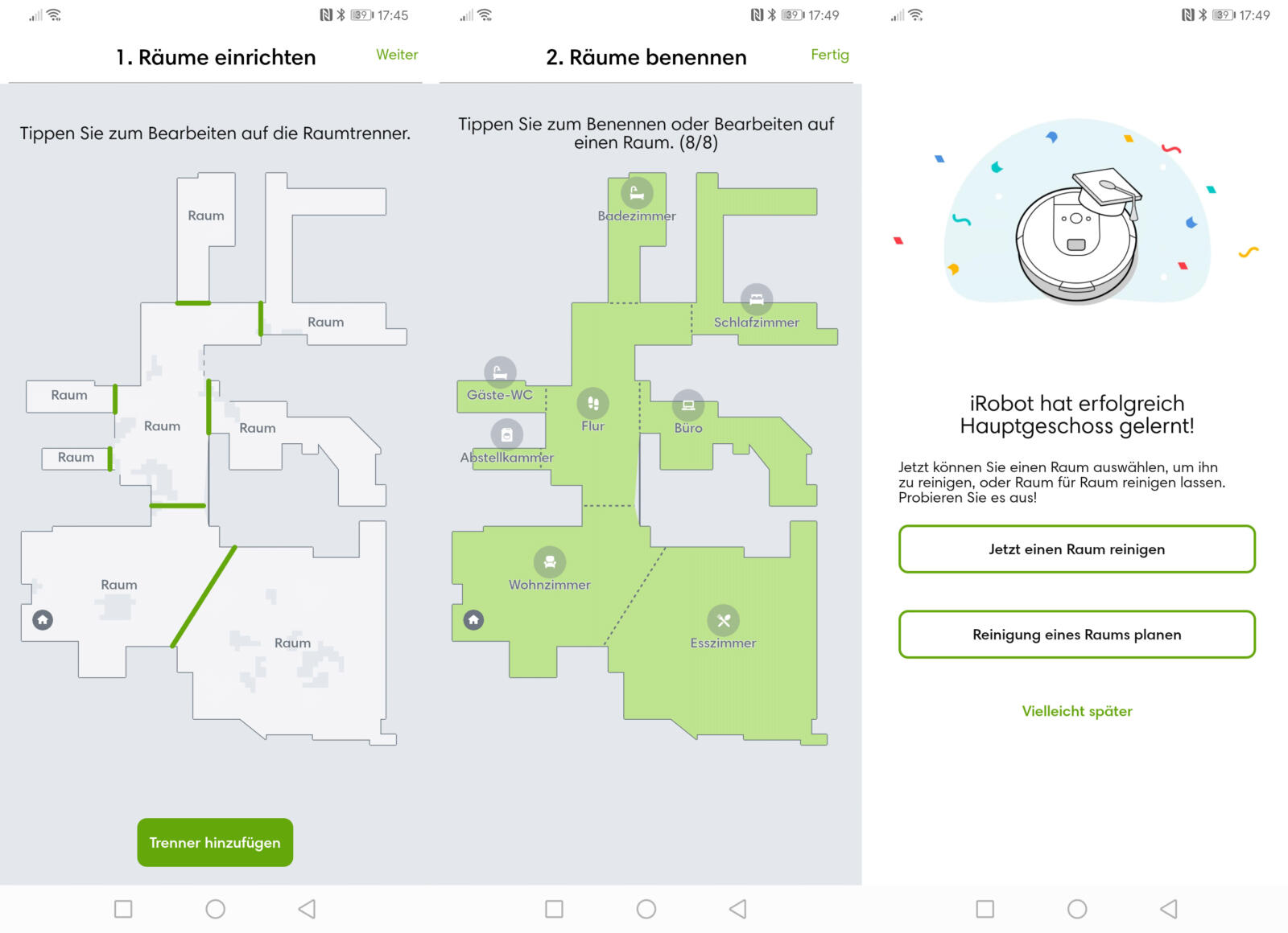 In meinem Fall habe ich deshalb das Büro mal abgewählt, da hier immer irgendwelche Kabel im Weg herumliegen. Das klappte im Alltag prima. Der Sauger fuhr alle zwei Tage durch die Wohnung und ließ das Büro ganz artig aus.