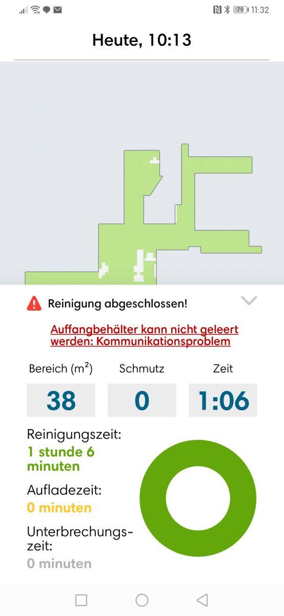 Treten Probleme auf, so wird der Anwender unter anderem über die App informiert. Im folgenden Screenshot beispielsweise über ein Kommunikationsproblem, welches verhinderte, dass der Staubbehälter des i7+ geleert werden konnte.