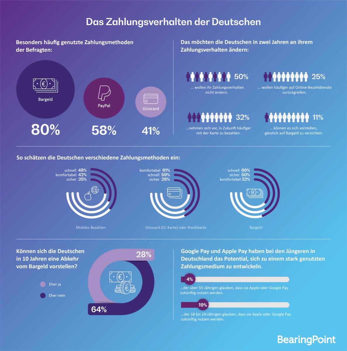 Zwar ist Bargeld noch immer das beliebteste Zahlungsmittel – 80 Prozent nutzen es häufig. Jeder Zweite (50 Prozent) gibt jedoch an, sein Zahlungsverhalten in den kommenden zwei Jahren ändern zu wollen und jeder vierte Befragte kann sich sogar vorstellen, in fünf Jahren gänzlich auf Bargeld zu verzichten. Das ist das Ergebnis zweier repräsentativer Umfragen von YouGov im Auftrag der Management- und Technologieberatung BearingPoint.