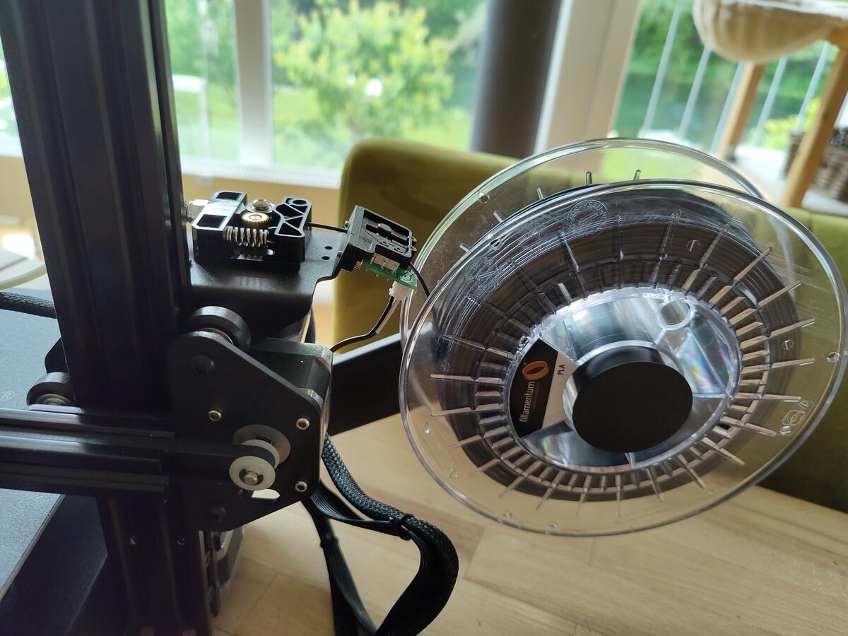 Zusätzlich ist auch ein Filament-Runout-Sensor enthalten, der direkt am Extruder montiert wird und für meinen Geschmack einen komischen Winkel aufweist. Ich bin noch nicht ganz dahinter gestiegen, ob die Rolle das Filament nun besser von unten oder von oben einliefern soll. :)