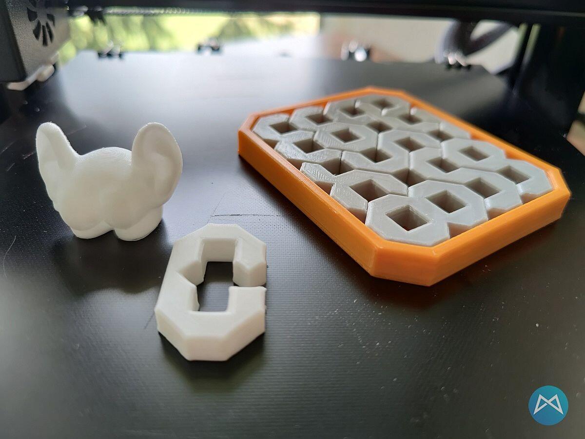 Man sieht sehr schön am Arsch mit Ohren, dass auch die Überhänge (das Ohrläppchen ist immer so ein Problemfall) gut gedruckt wurde. Ironing klappte ebenfalls sehr schön (sieht man an der Null in der unteren Mitte) und auch das Quiz in Orange/Grau passte prima zusammen.