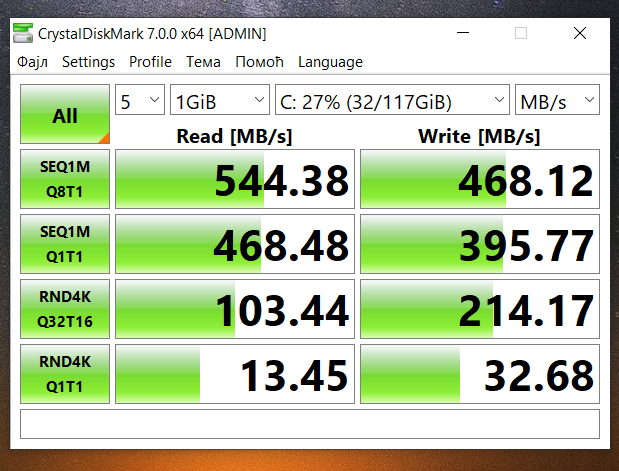 Das ist jetzt nicht wirklich schnell. Aber wie eben erwähnt genügt es für diese Arbeiten am Rechner. Dennoch habe ich den Speed des Speichers mit ein paar anderen Geräten, die ich gerade zur Hand hatte verglichen. Das schaut dann so aus wie auf den folgenden Screenshots.