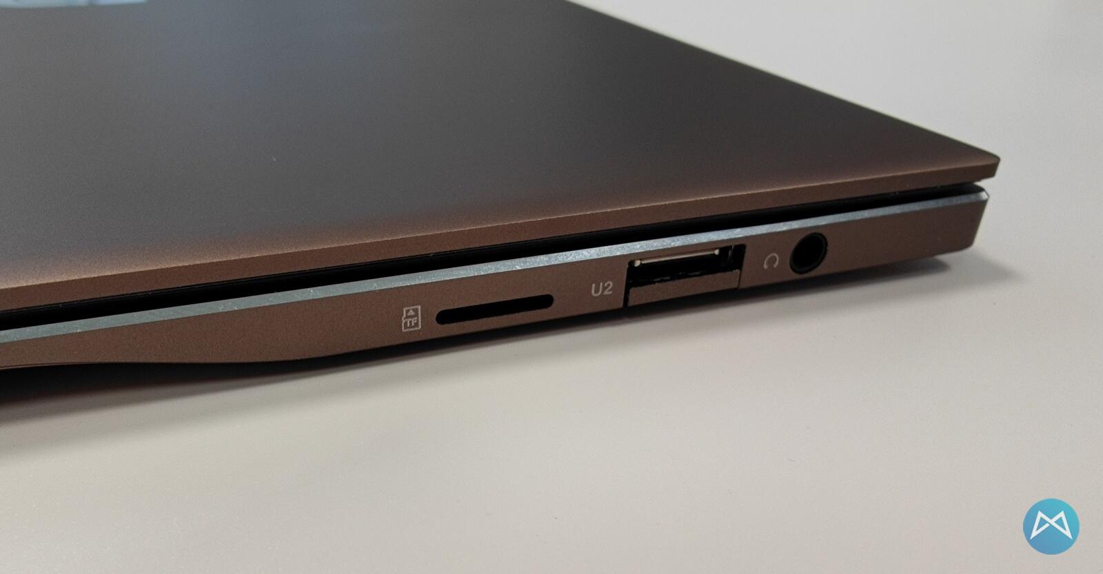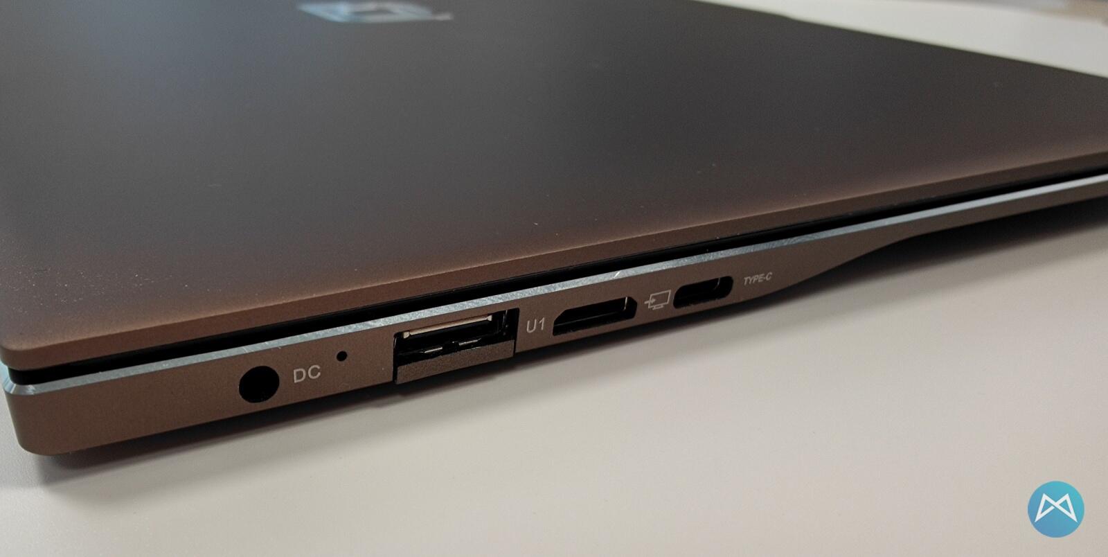 Auf der rechten und linken Seite gibt es am EZbook noch massig Anschlüsse zu verzeichnen. Links ist der Stromanschluss, ein USB-Typ-A Anschluss, ein Mini-HDMI und ein USB Typ-C Anschluss verbaut worden und auf der rechten Seite finden wir das Speicherkartenlesegerät, dazu noch einen USB-Typ-A Anschluss und den Klinkensteckeranschluss. Die beiden Typ-A Anschlüsse sind dabei verglichen mit dem Gehäuse so dick, dass sie wie bei anderen Herstellern der Netzwerkanschluss, aufgeklappt werden müssen.