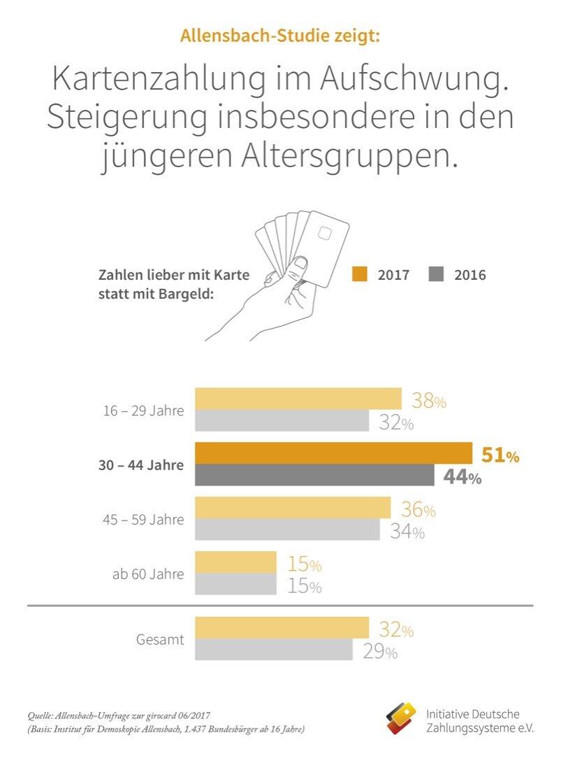 Mit den 30- bis 44-Jährigen gibt es in Deutschland nun erstmals eine Altersgruppe, in der die Mehrheit nach eigener Aussage grundsätzlich lieber mit Karte zahlt. Auch insgesamt stieg der Anteil derjenigen Bundesbürger, die die Kartenzahlung einer Barzahlung vorziehen erneut, auf nunmehr rund ein Drittel an. Zückten 2016 noch 29 Prozent lieber die Karte als Bargeld, steigerte sich dieser Wert in 2017 auf 32 Prozent.