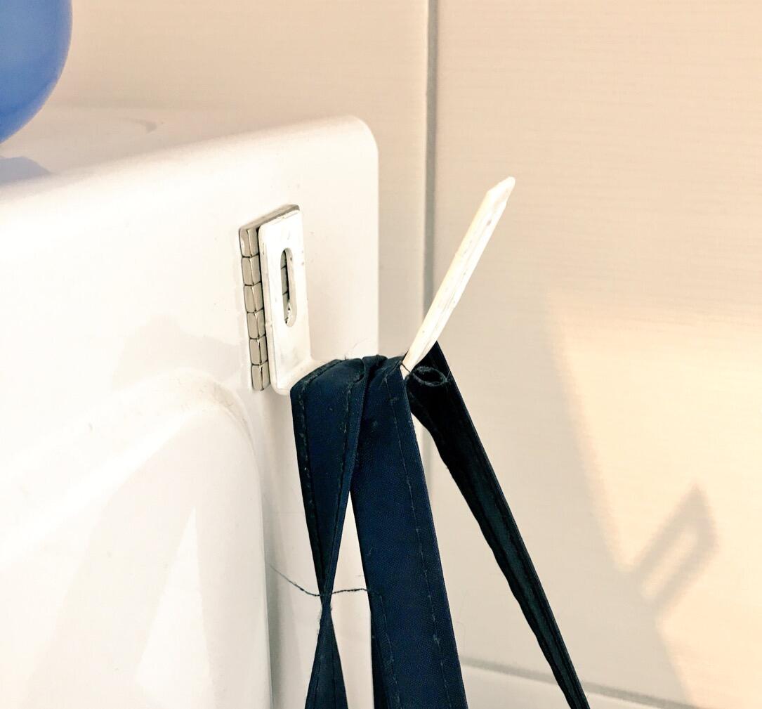 Ein kleiner Metallbügel wurde mithilfe von Magneten zu einem Beutelhaken, der an der Seite der Mikrowelle befestigt wurde.