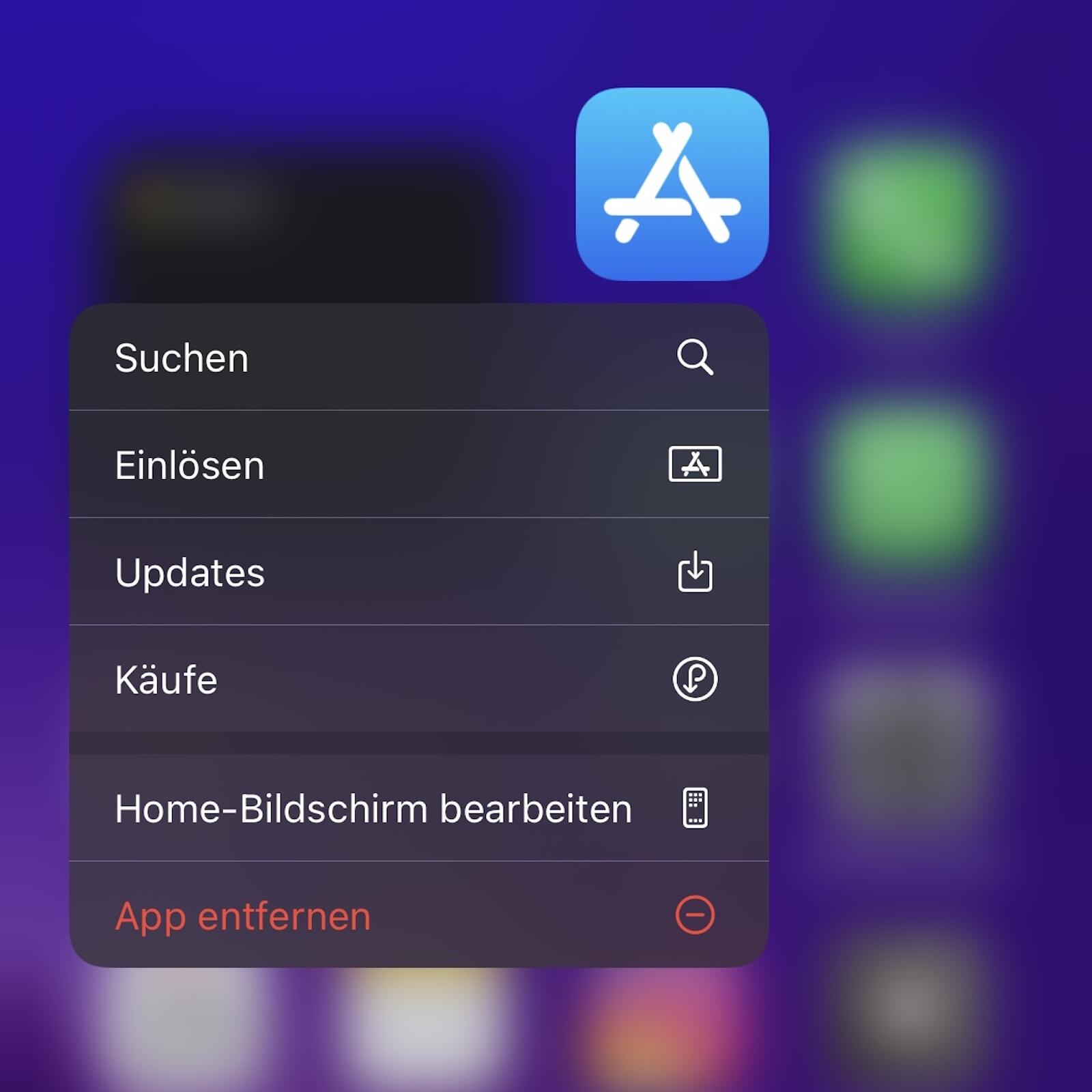 Und was ist mit der Abkürzung, wenn man länger auf das App-Icon drückt und dann das Menü erscheint? Ja, das ist okay. Aber es kommt immer noch vor, dass ich zu lange auf dem Icon bleibe oder auf „Einlösen“ oder „Käufe“ klicke.