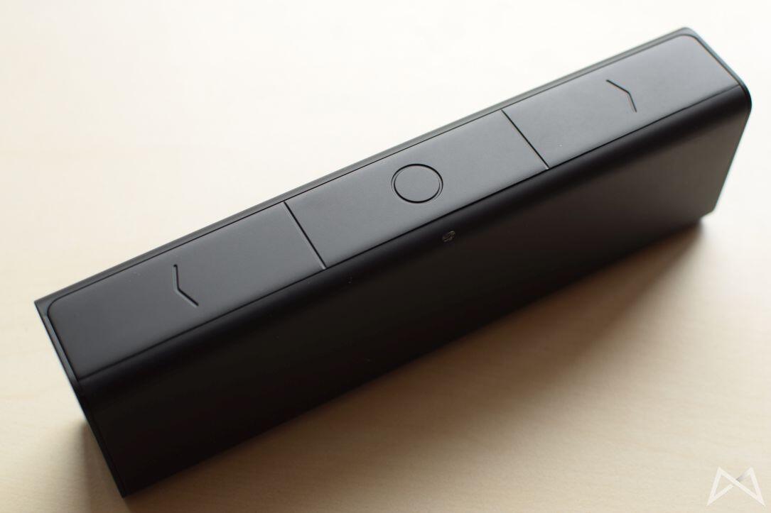 Auf der Oberseite gibt es drei gut erreichbare, große Bedientasten. Zu beachten gilt, dass der Kreis keine eigene Taste darstellt, sondern lediglich der Markierung dient. Leider trüben die Tasten den ansonsten sehr guten Ersteindruck des Geräts. Während sonst keine unregelmäßigen Spaltmaße auffallen und auch der gummierte Kunststoff zu gefallen weiß, sind die Tasten arg wackelig gestaltet.