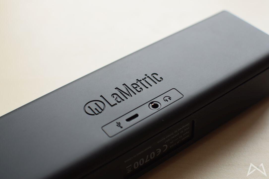 Auf der Rückseite sind hingegen der micro-USB-Eingang und eine Klinkenbuchse zum Audio-Output vorzufinden. Dazu besitzt LaMetric zwei nach außen gerichtete Lautsprecher, einen Power-Button auf der rechten Seite sowie links zwei Lautstärke-Buttons. Die Unterseite ist gummiert gestaltet, wodurch ein Verrutschen auf glatten Oberflächen so gut wie ausgeschlossen ist.