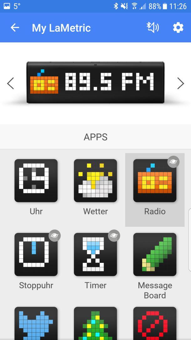 Wie erwähnt besitzt LaMetric integrierte Stereo-Lautsprecher. Diese können nicht nur Benachrichtigungstöne abspielen, sondern ermöglichen auch die Musikwiedergabe. Es ist möglich, direkt vom favorisierten Radioprogramm geweckt zu werden, und LaMetric damit als Ersatz für einen Radiowecker zu benutzen.