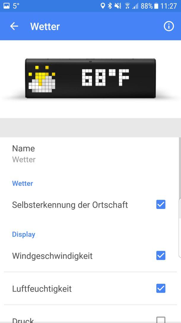 - Konfiguration über das Smartphone: Standort-Wahl (oder „automatisch“), Informationen ein- und ausblenden, Einheiten festlegen