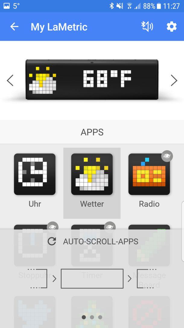 In der Smartphone-App ist es auch möglich, sämtliches App-Durchschalten zu verbieten oder automatisches Wechseln zwischen den Anwendungen zu aktivieren. So kann LaMetric dann auf dem Schreibtisch stehen bleiben und fungiert ohne weiteres Zutun als erweiterte Uhr, welche auch über Twitter-Follower, Wetter, etc. informiert. Möchte man nur die Uhrzeit wissen, muss man dann allerdings meist etwas warten, manuell zur Uhrzeit schalten oder eben doch auf das Smartphone schauen.