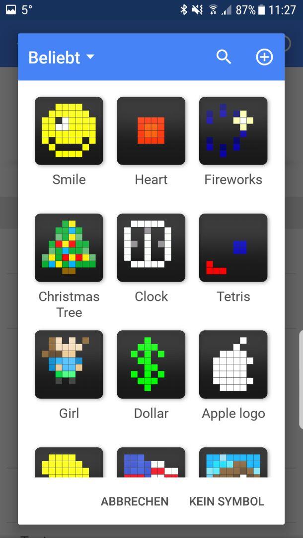 In den meisten Anwendungen wird rechts ein 8×8 Pixel großes Icon angezeigt, häufig animiert. So wird im Wetterbericht beispielsweise eine vorbeiziehende Wolke, ggf. mit fallenden Regentropfen gezeigt und der Sand in einer Stoppuhr läuft langsam runter, bis sie sich um 180 Grad dreht. Auch bei der Flagge als Icon für die Windgeschwindigkeit gelingt es erstaunlich gut, durch farbliche Abstufungen des Rot-Tons einen 3D-Effekt zu realisieren.