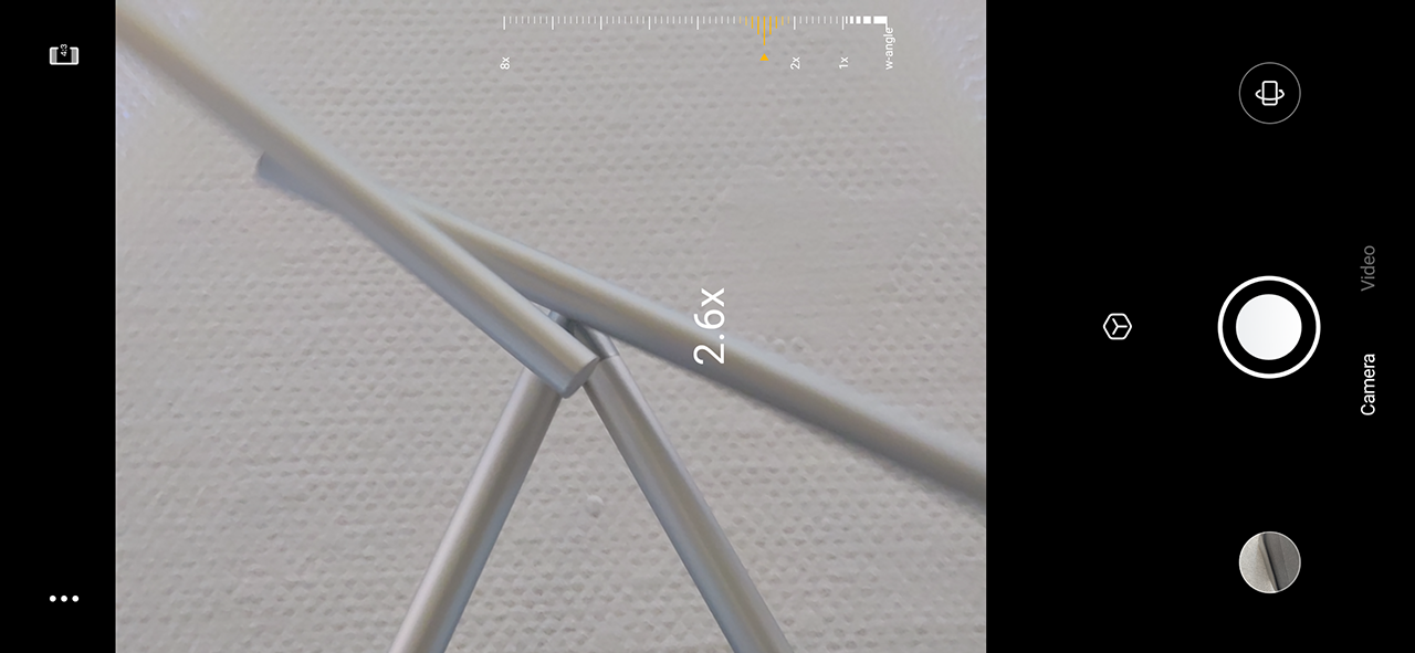 Man tippt auf den oben mittig platzierten Button, der den Vergrößerungsfaktor anzeigt. Anstatt einer Auswahl der verschiedenen Linsen, präsentiert die App einen frickeligen Slider, der ab einem Wert von 2,0 auf die Telelinse und unterhalb eines Wertes von 1,0 auf die mit Weitwinkel-Brennweite wechselt. Das klingt in der Theorie vielleicht recht intuitiv. Ist es in der Praxis aber nicht – nicht mal ansatzweise!