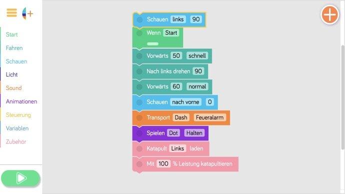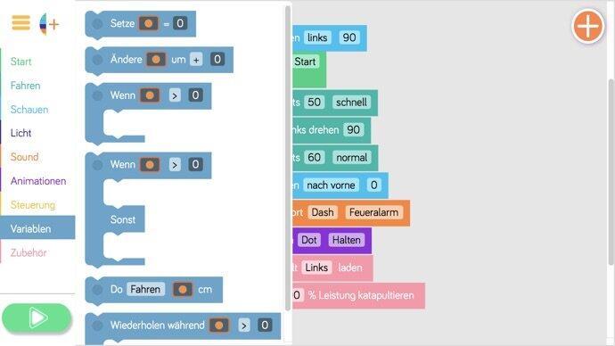 Per Drag and Drop werden Bausteine untereinander angeordnet und ergeben dann so eine komplette Codezeile, die Dash dann ausführt. Innerhalb der einzelnen Bausteine verbergen sich Parameter die einzeln angepasst werden können. Da wären zum Beispiel Aktionen wie „Fahre x Zentimeter vorwärts, drehe dich dann um x Grad nach links/rechts“ oder „Wenn Bedingung x erfüllt ist, löse Aktion x aus“.