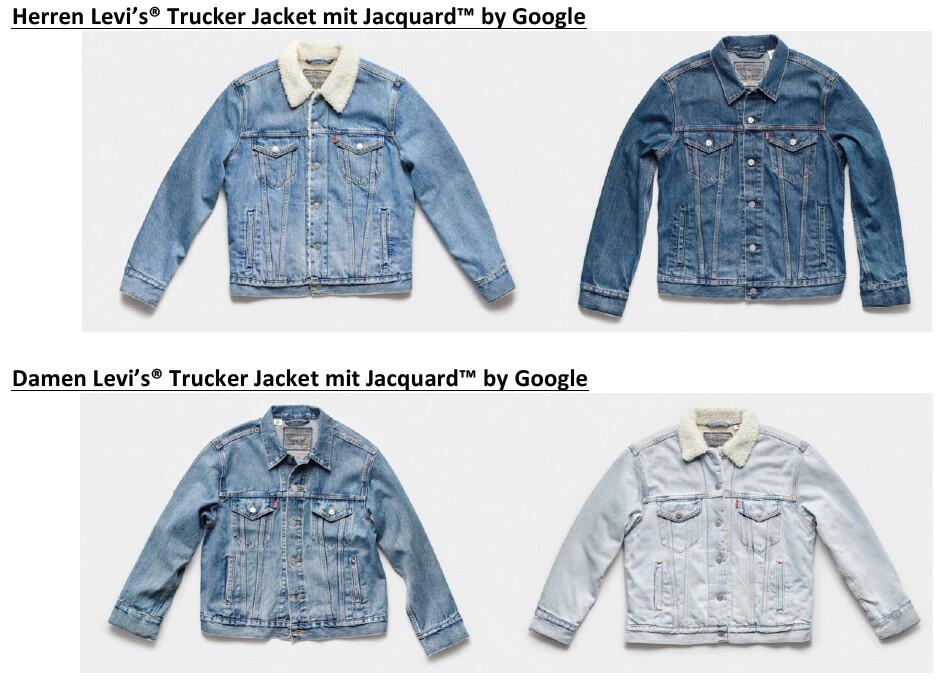 Mittels Jacquard by Google ausgerüstet, gibt es die Jacke Trucker für Herren und Damen und Sherpa Trucker Styles. Mittels Gesten am Handgelenk (der Sensor ist kleiner als ein Kaugummi und befindet sich an der Manschette) können beispielsweise Wetter- und Verkehrsberichte, Nachrichten, Musik usw. gesteuert und abgerufen werden.