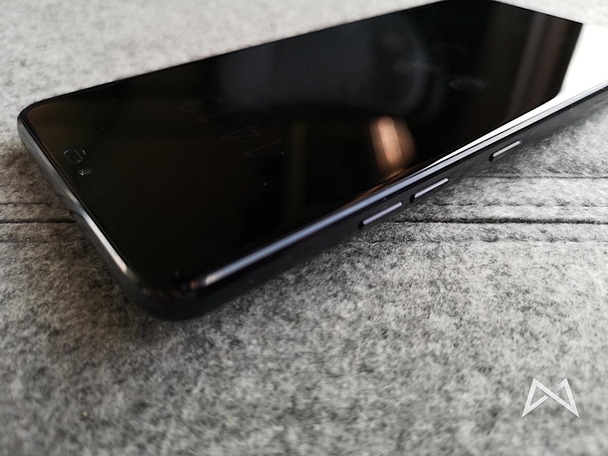 Das G7 ThinQ ist komplett in schwarz gehalten. Auch der Metallrahmen. Auf der Rückseite finden wir die normale und die neue Weitwinkel-Kamera nebst dem darunter liegenden Fingerabdrucksensor. Auf der Oberseite ist ein Mikrofon und der SIM/MicroSD-Slot und auf der rechten Seite befindet sich der Powerbutton.
