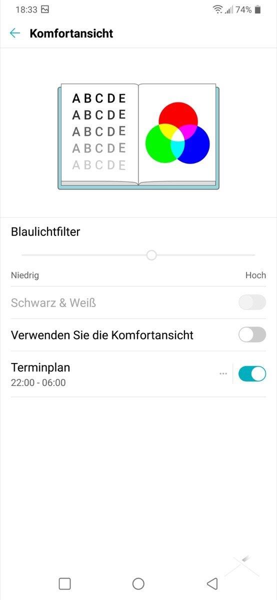 Natürlich gibt es auch auf dem G7 einen Nacht-Mode, bei dem das Display ein wenig mehr ins gelbe bzw. Augen schonende getaucht wird. LG nennt das Komfort-Ansicht und selbige kann aktiviert/deaktiviert oder nach einem Zeit-Schema gestartet werden.
