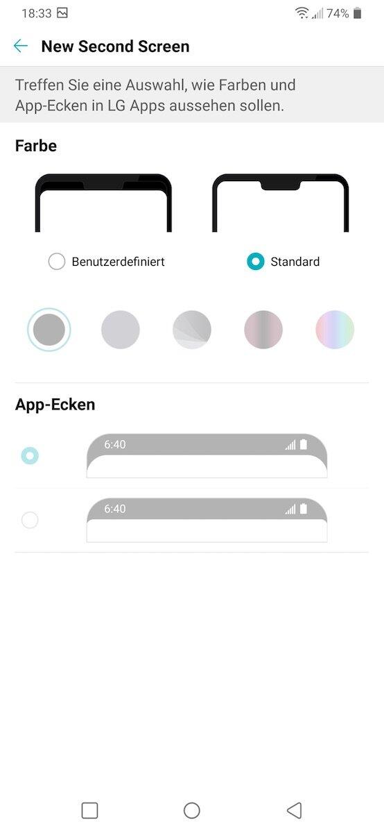LG erweitert die Optionen noch ein wenig und so kann auch noch eingestellt werden, ob die Ohren der Notch eine bestimmten Hintergrund haben sollen und wie die Ecken ohne Notch abgerundet werden sollen.